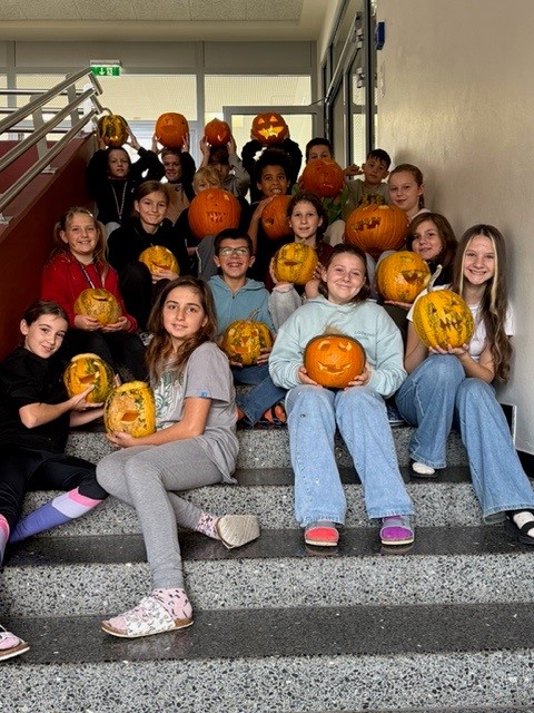Mit Löffeln, Schnitzwerkzeugen und viel Kreativität entstanden viele verschiedene Kürbisschädel – manche fröhlich, manche richtig schaurig. Zum Abschluss wurden die fertigen Kunstwerke noch mit LED-Teelichtern bestückt und stolz auf dem Treppenaufgang präsentiert.