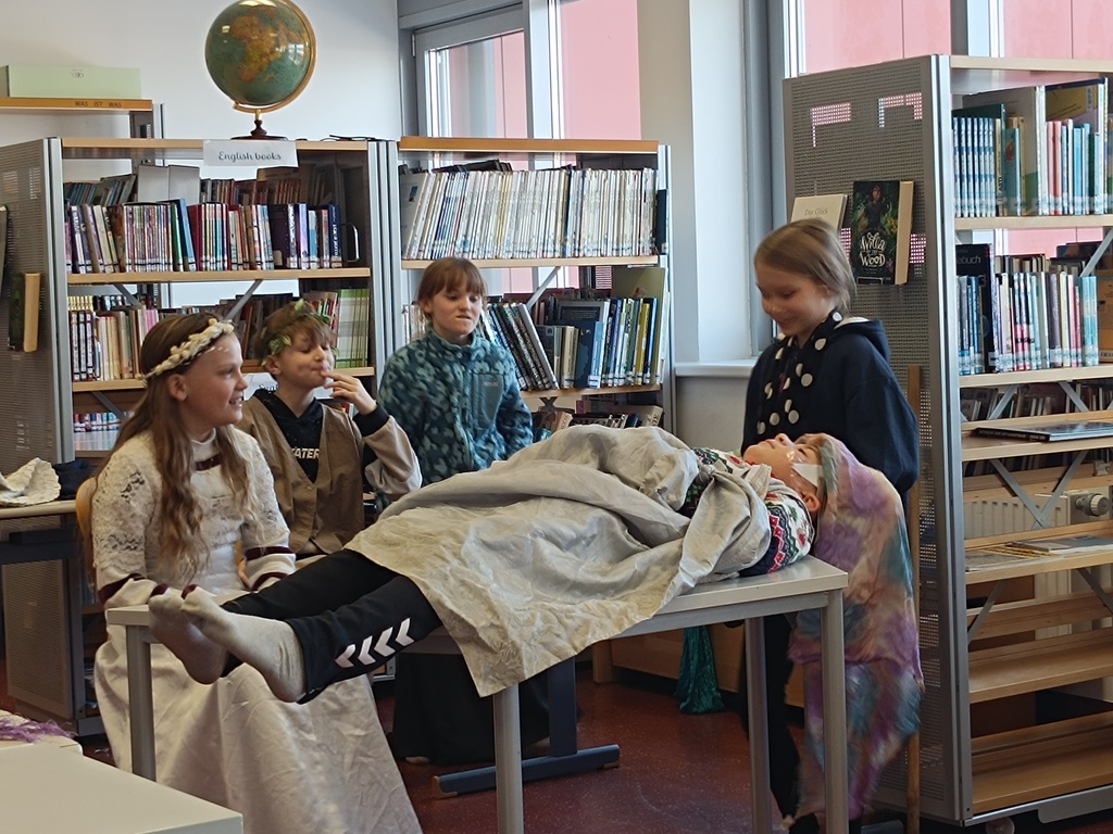 Im Anschluss durften die Kinder selbst aktiv werden: In Gruppen wählten sie eines der Märchen aus und stellten es schauspielerisch dar – mit Kostümen, Musik und viel Kreativität. Dabei hatten die Schülerinnen und Schüler großen Spaß und konnten ihr schauspielerisches sowie erzählerisches Talent unter Beweis stellen.