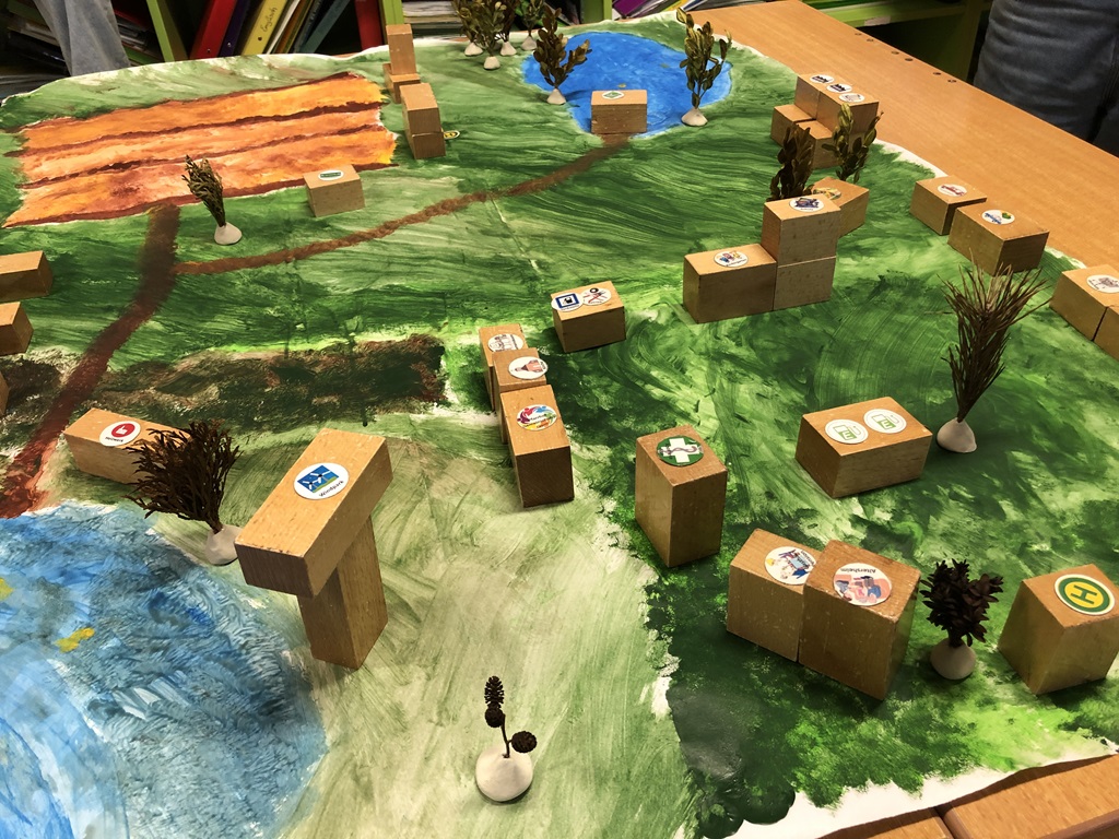 Interaktiv mit Farben, Papier und Bauklötzen wurde in Gruppenarbeit eine Kleinstadt geplant. Die Schüler*innen überlegten gut, wo sie Verkehrsflächen, Wohngebiete, öffentliche Gebäude, etc. bauen würden.